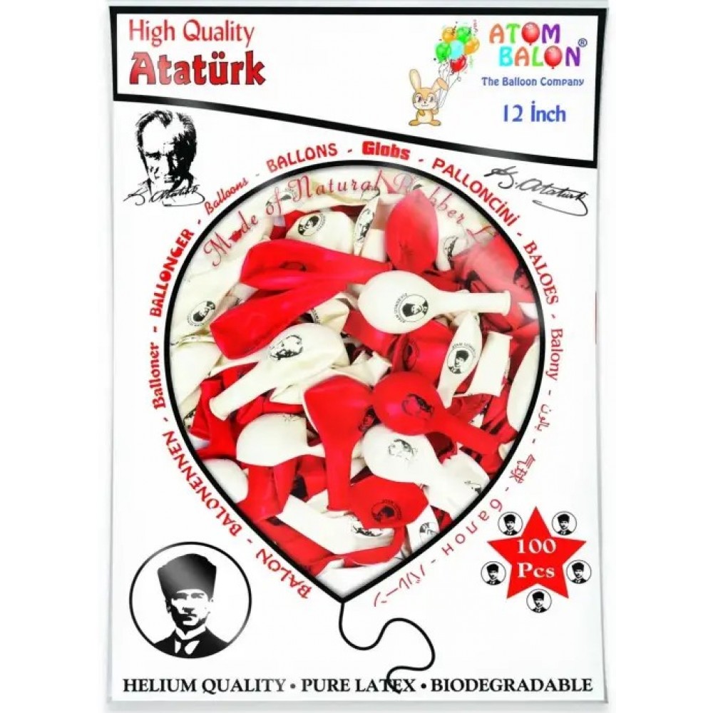 Atom Balon Atatürk Baskılı 100'lü paketler , 12 inç (yaklaşık 30 cm) uzunluğunda, kaliteli lateks üretimiyle üretilen, 29 Ekim, 23 Nisan ve 10 Kasım gibi mili günlerde kullanıma uygun, Atatürk imzalı veya silueti dolu destekleyici balonlardır. Kırmızı-beyaz karışık veya tek renk seçenekleriyle, paket içi 100 adet olarak satılır.
